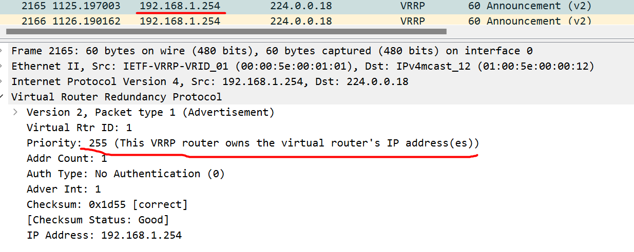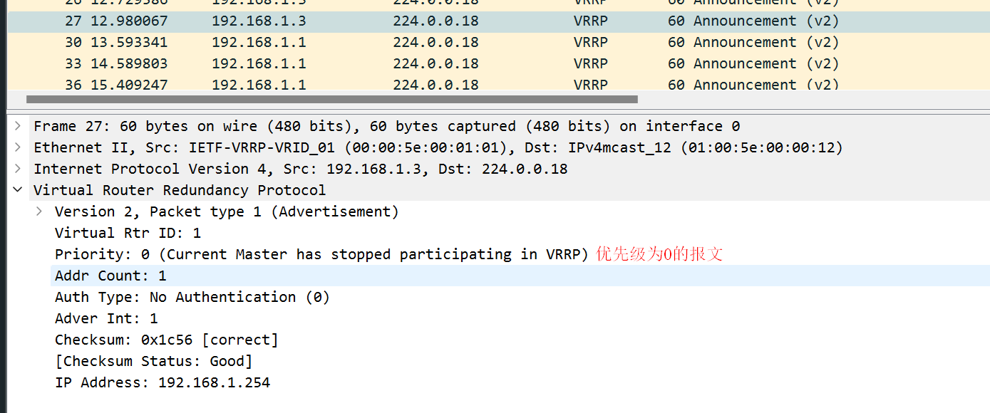 关于辞职,当master路由器接口shutdown时,会立即发送优先级为0的通告,vrrp中优先级为0表示不参与虚拟组计算,收到的backups之间会立即重新选举出新的master,否则就要等待3秒的报文超时再选举,这样可以加快收敛时间。优先级为0的报文如下: